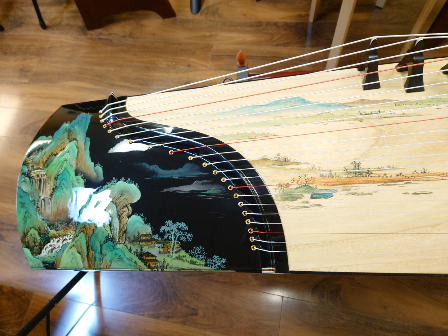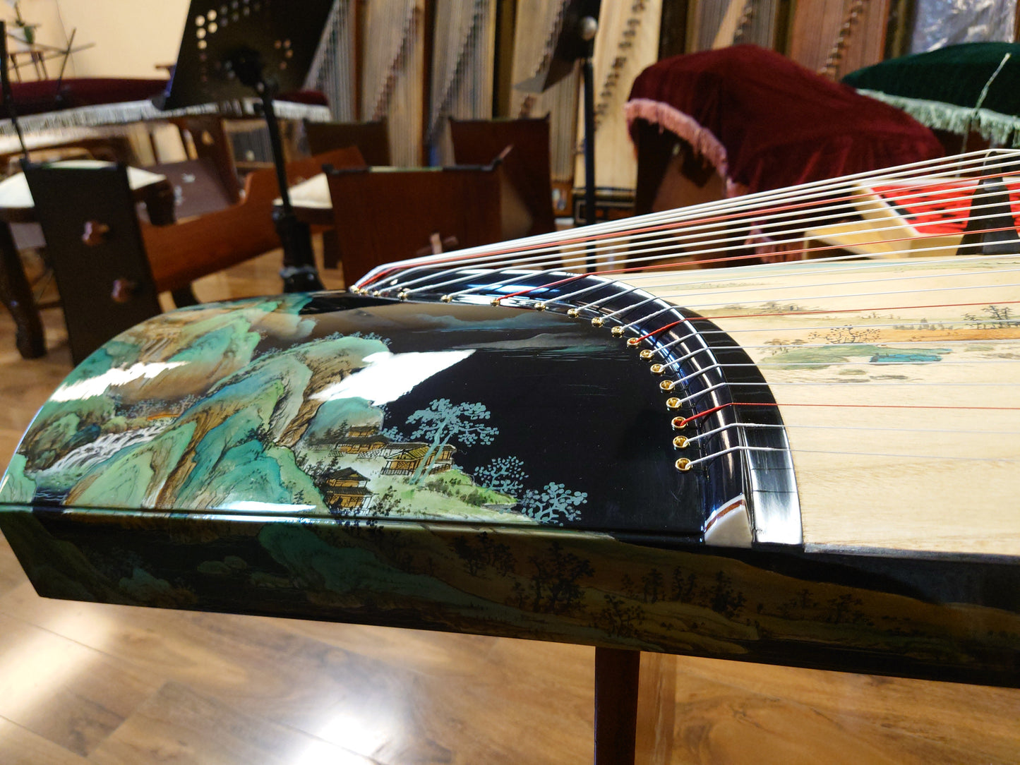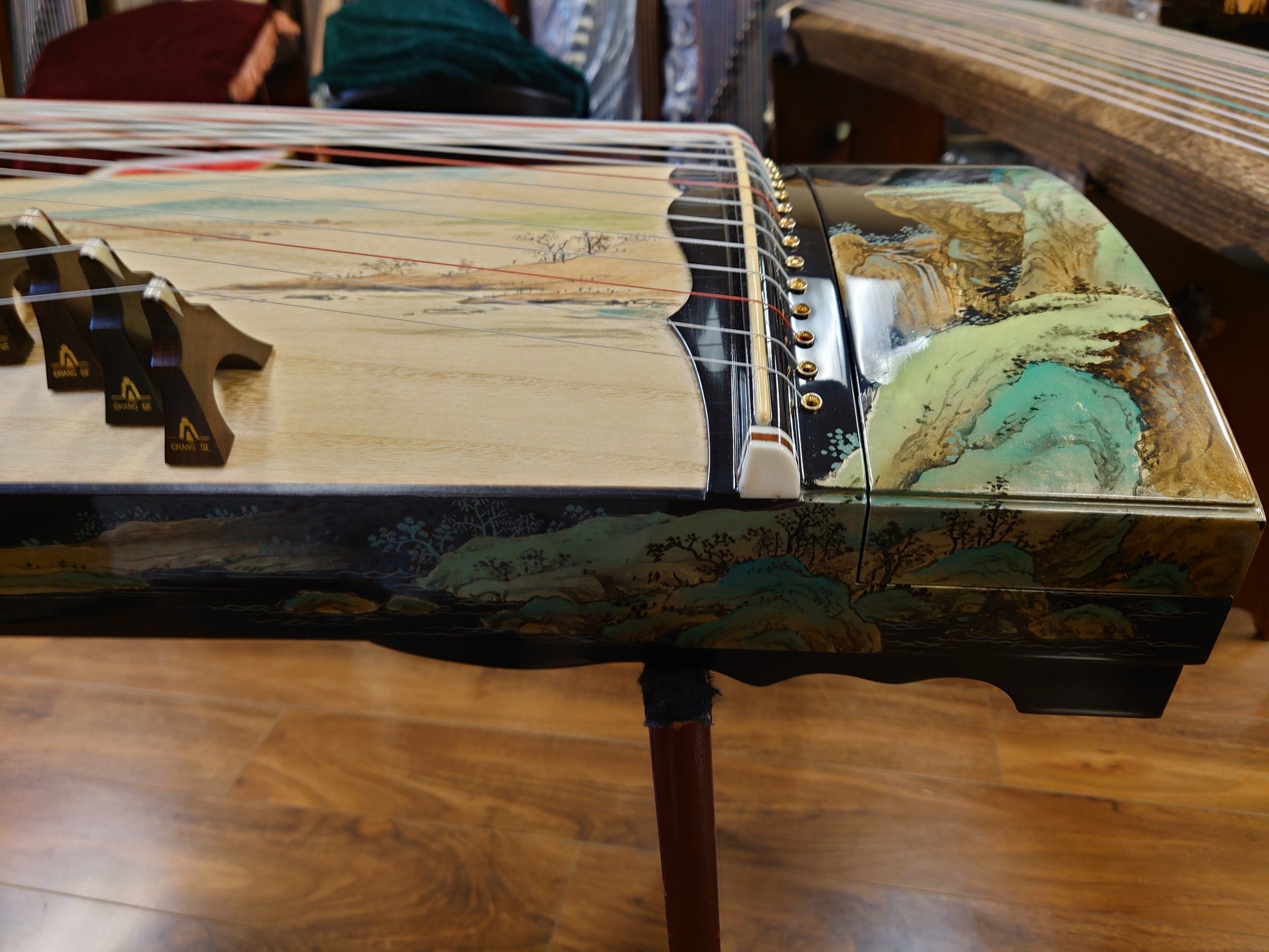 The guzheng is beautifully painted with natural lacquer in the "Thousand Li of Scenery" pattern all over the body, making it a true work of art.
