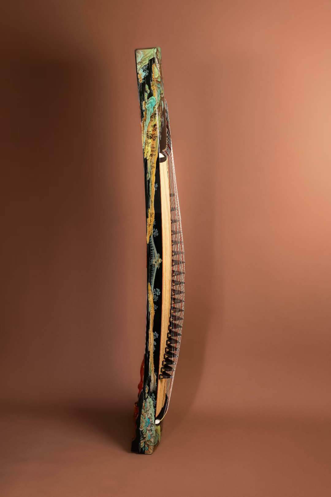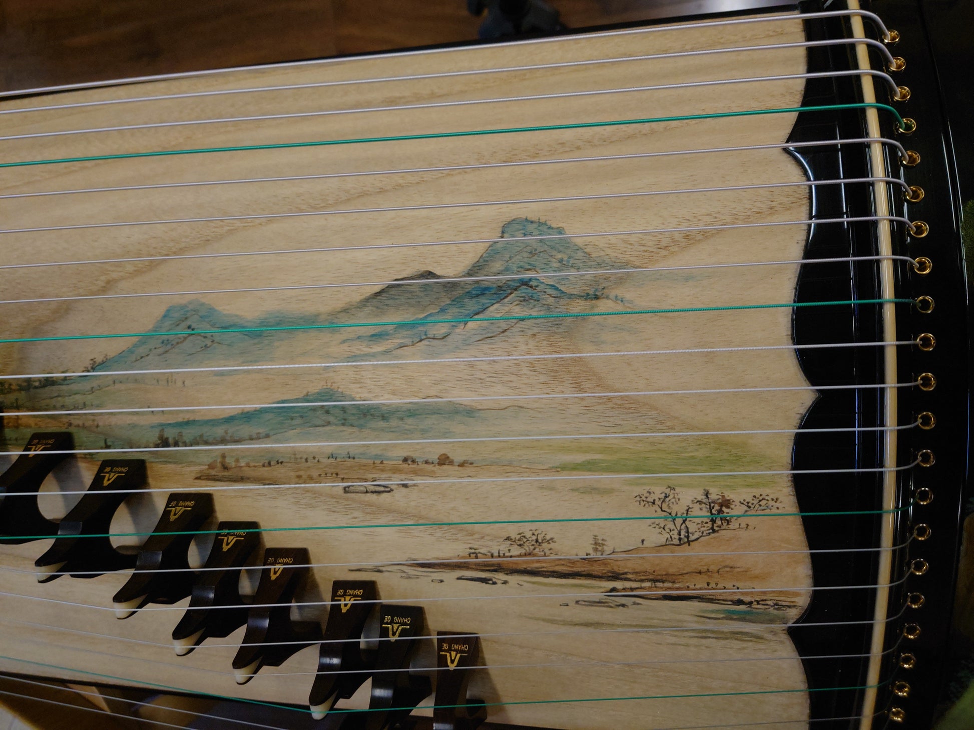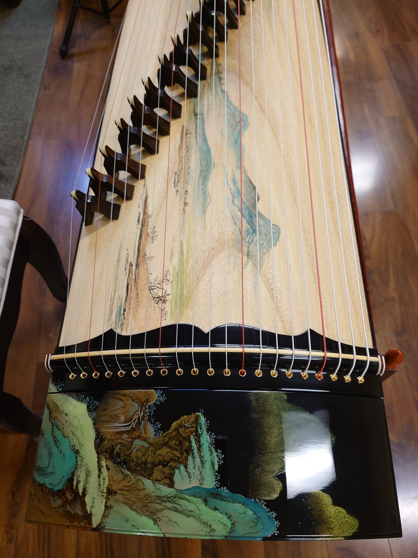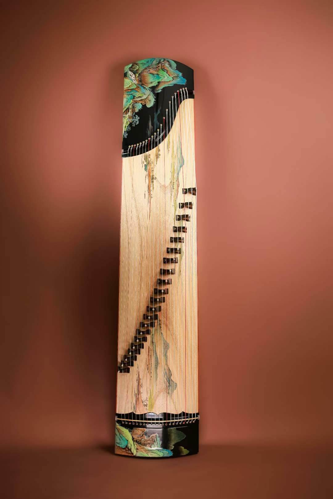 The guzheng is beautifully painted with natural lacquer in the "Thousand Li of Scenery" pattern all over the body, making it a true work of art.