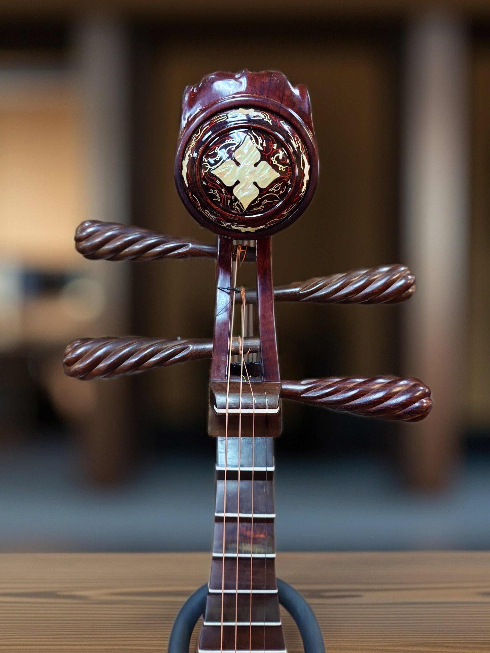 The body and side panels are crafted from carefully selected suanzhi rosewood, offering a warm tonal character and a refined, traditional appearance. The tuning pegs are made from aged Thai rosewood, prized for its density, durability, and long-term stability. The pipa head features a finely carved circular motif accented with gold floral inlay, adding an elegant and classical touch. This instrument comes complete with a full accessory set, including a hard case, finger picks, and spare strings, making it a distinguished NAMM Show piece suitable for both stage and collection.