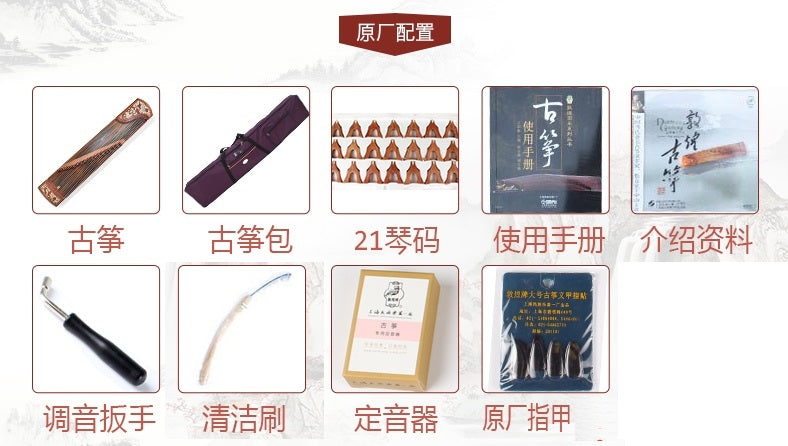 This guzheng comes free finger picks, 1-7 spare strings, 2-pieces stands, chromatic guzheng tuner, cleaning brush, and a soft case.