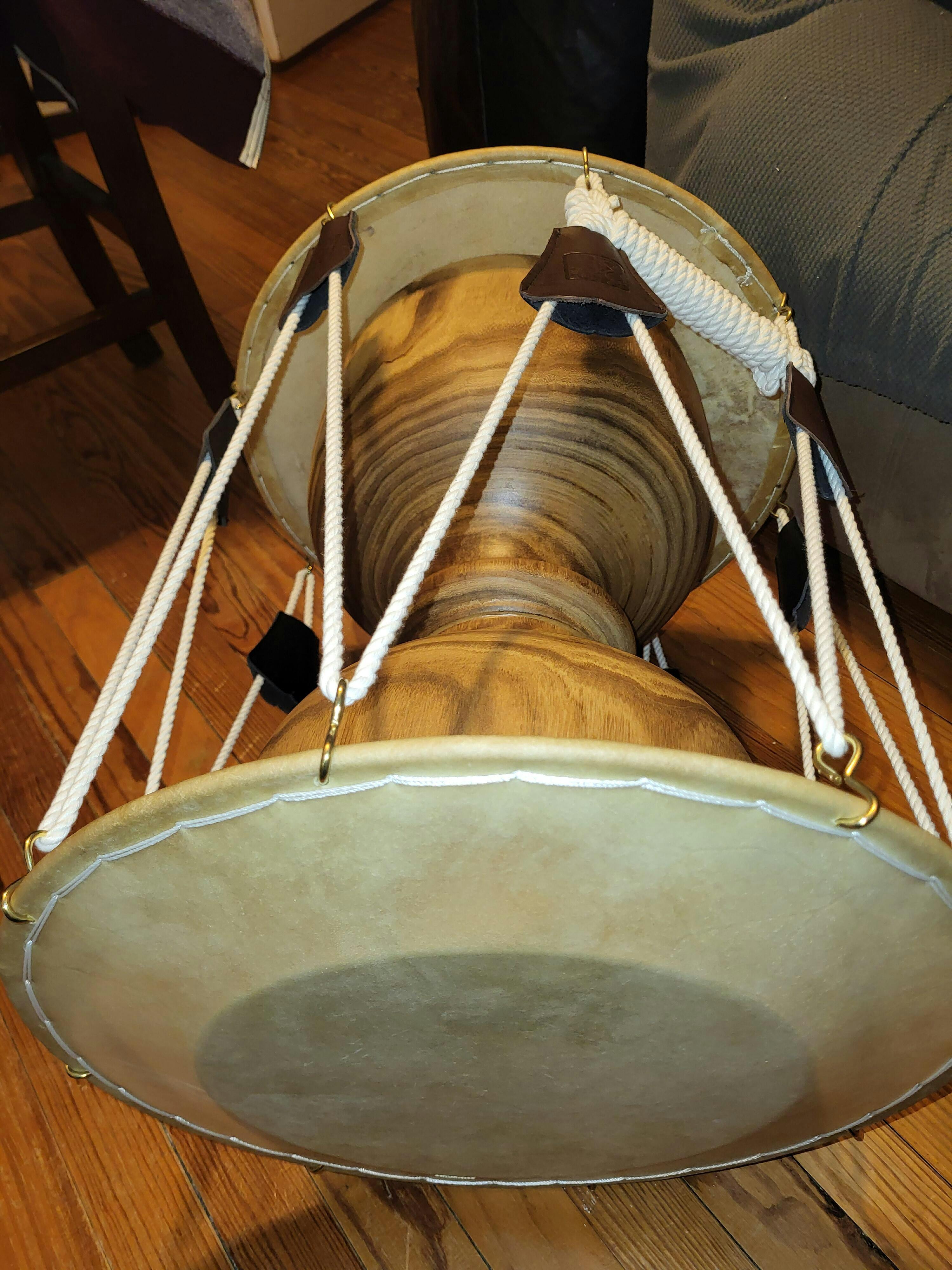 This janggu is size 1.7, 51cm in length and 43.5cm in drum skin diameter (20 x 17 inches) adult size. This size is best for bigger adult to play while sitting on the floor. It's made by one of the best Korean drum maker. This model is a standard model with quality cowhide skin and pine wood.