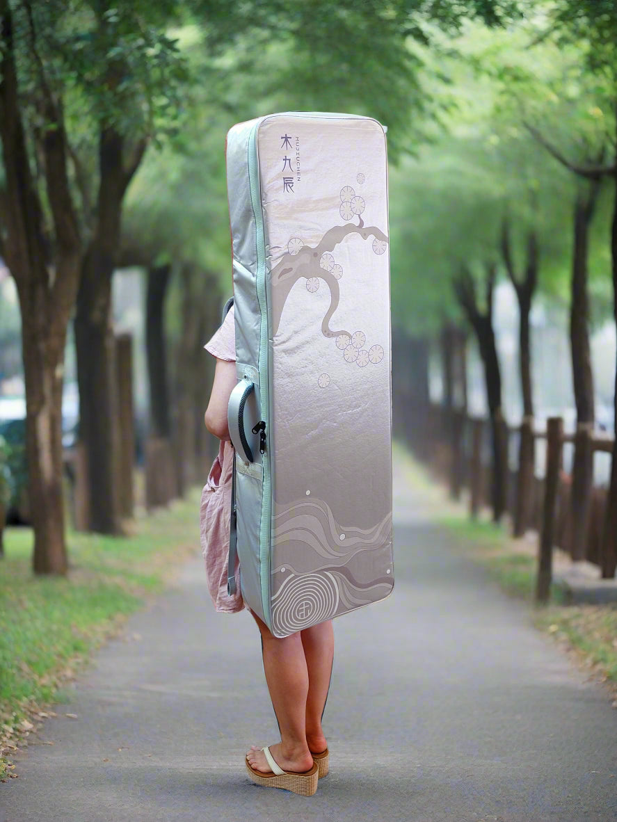 The Mujiuchen "Green Pine" is a premium 108cm travel-size guzheng crafted for musicians who seek portability without compromising on tone. This compact model features a rich green-stained pinewood frame accented with subtle natural grain and minimalist design—perfect for modern players with a refined aesthetic.
