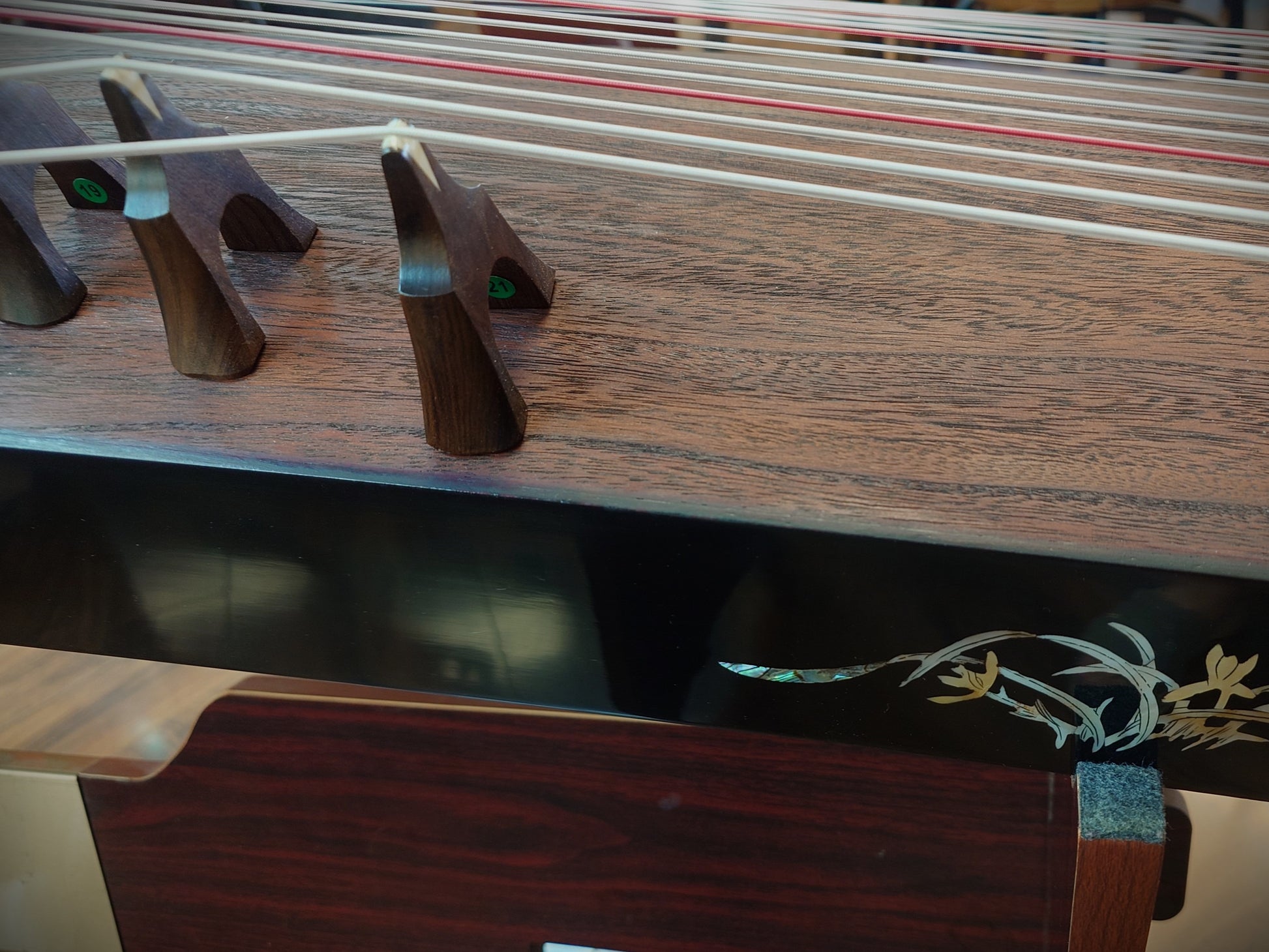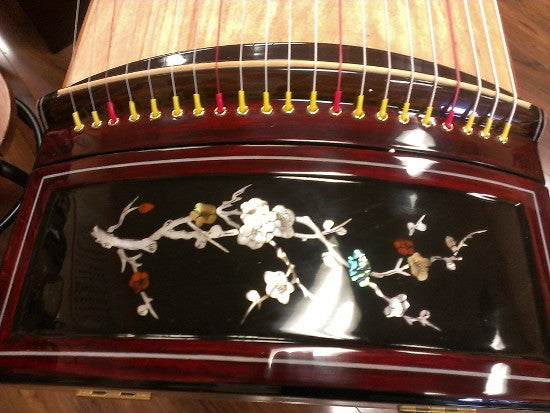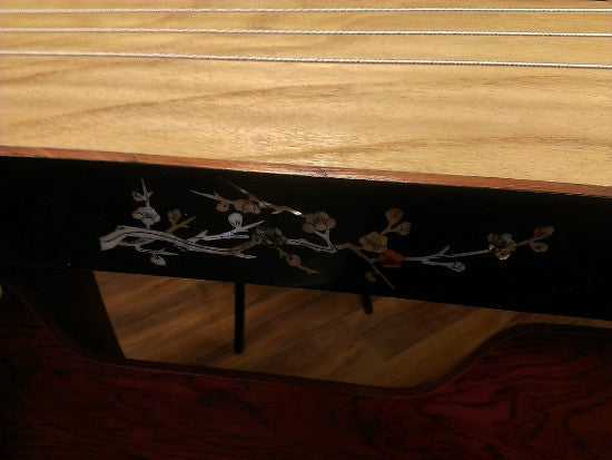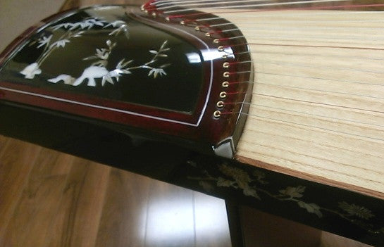 This beautiful instrument, featuring Mother-of-Pearl inlay, is made with paulownia wood that has been naturally air-dried for at least 7 years. The design of its body structure is unique. The body board, made from paulownia (pao-tong) wood naturally grown in Henan Province, is hollowed out in the middle to improve sound quality. This process uses almost an entire tree for a single guzheng.