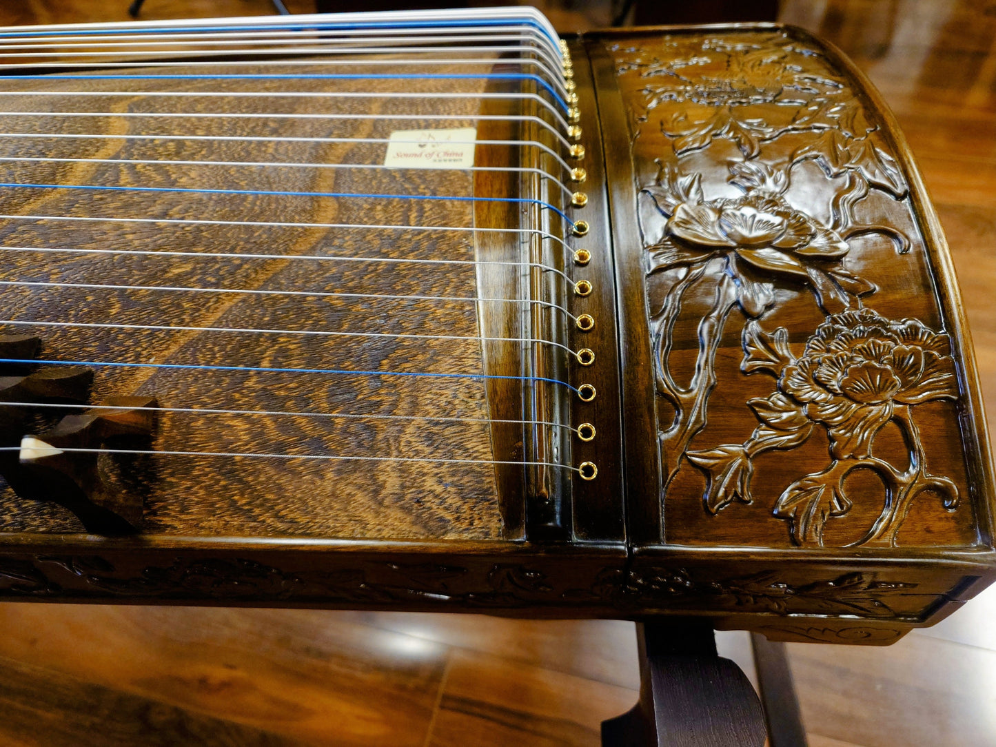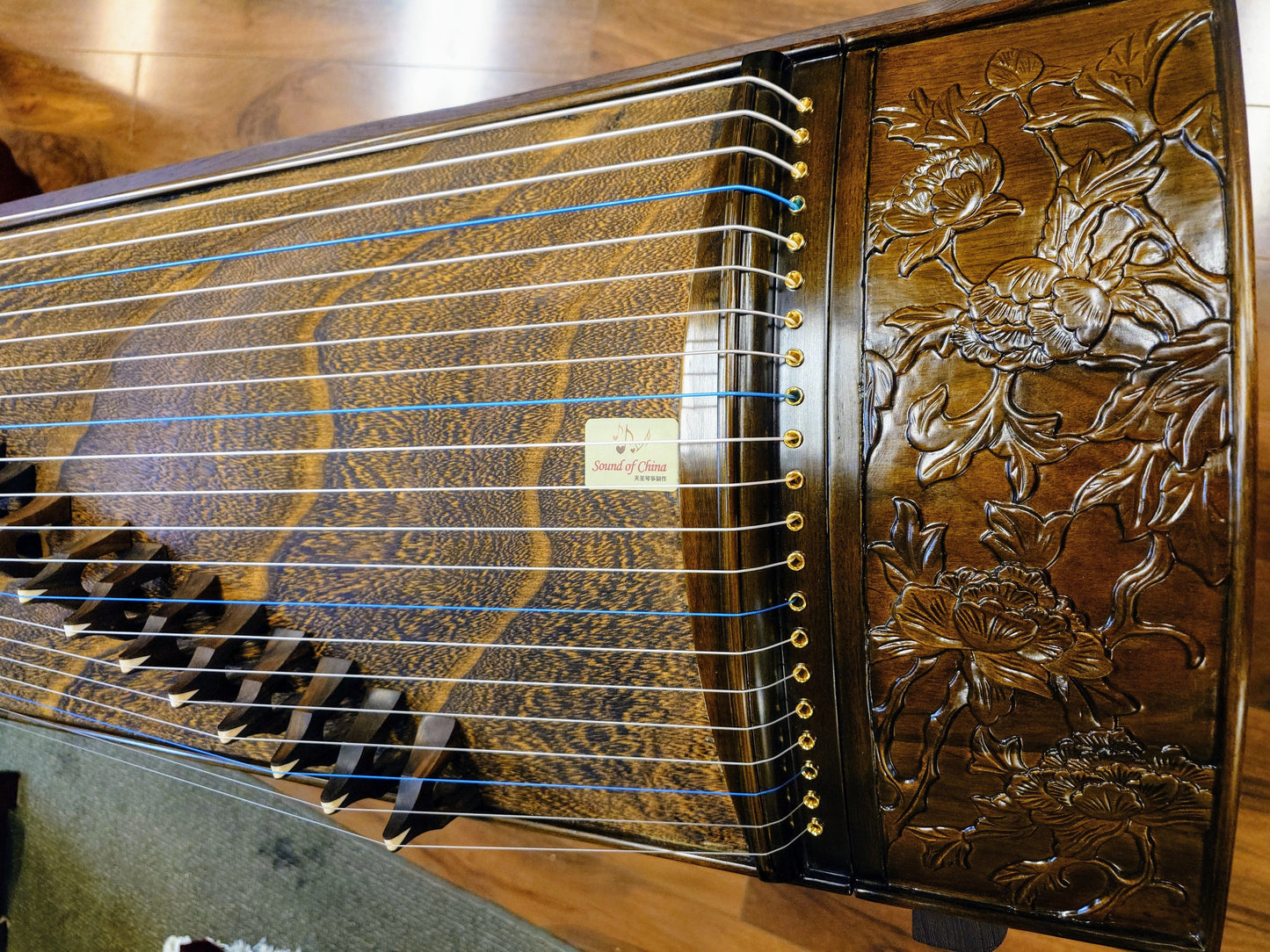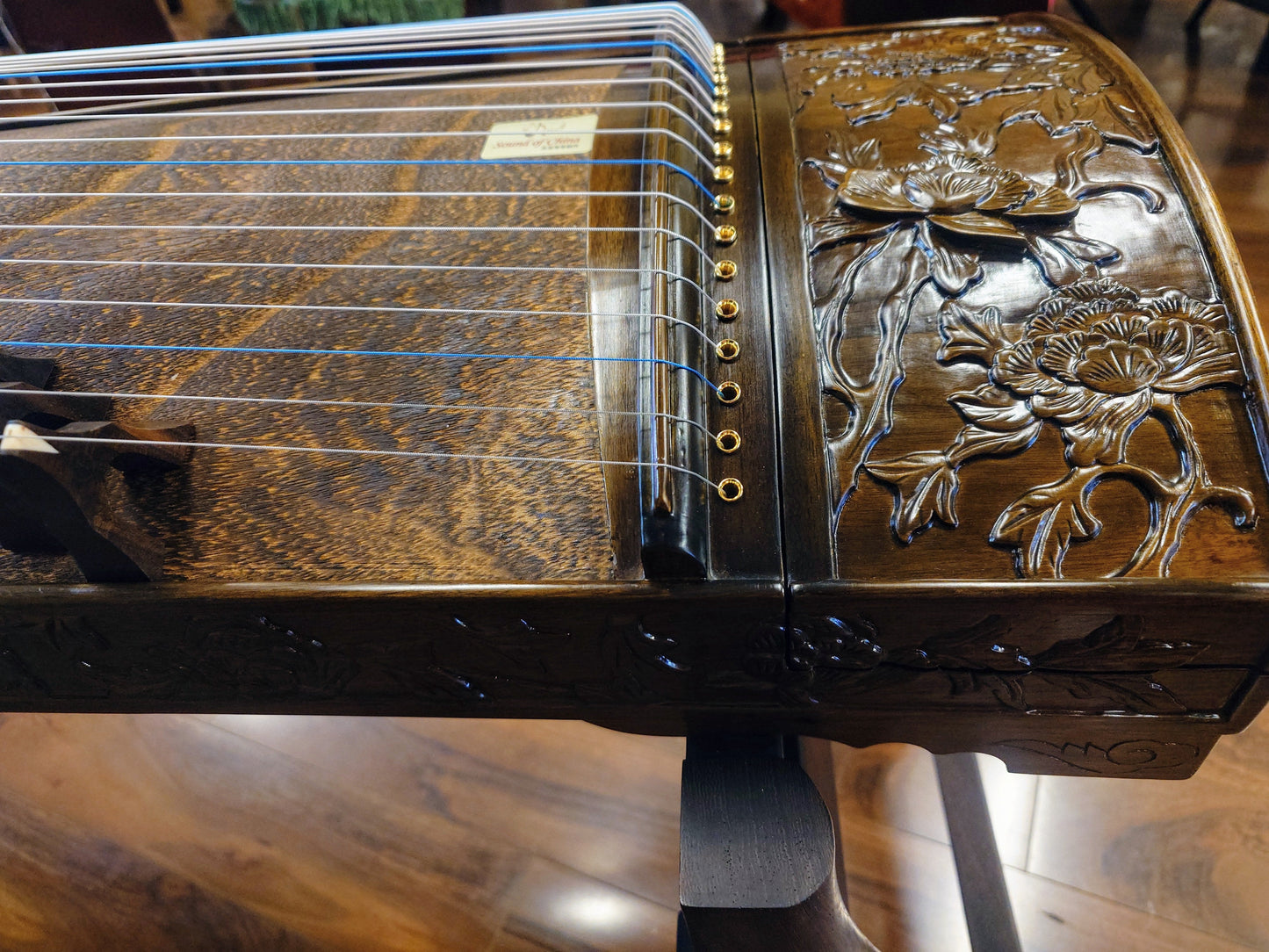 We are proud to introduce the new Sound of China carved-out guzheng. This beautiful instrument is custom-designed by Sound of China Guzheng Music, with all materials carefully selected by professionals. The sound body is carved from a single piece of paulownia wood and framed with Golden-Thread Nanmu wood, featuring the "Enchanted Rose" pattern carved using traditional techniques. The result is a rich, warm, mellow sound with a hint of sweetness.