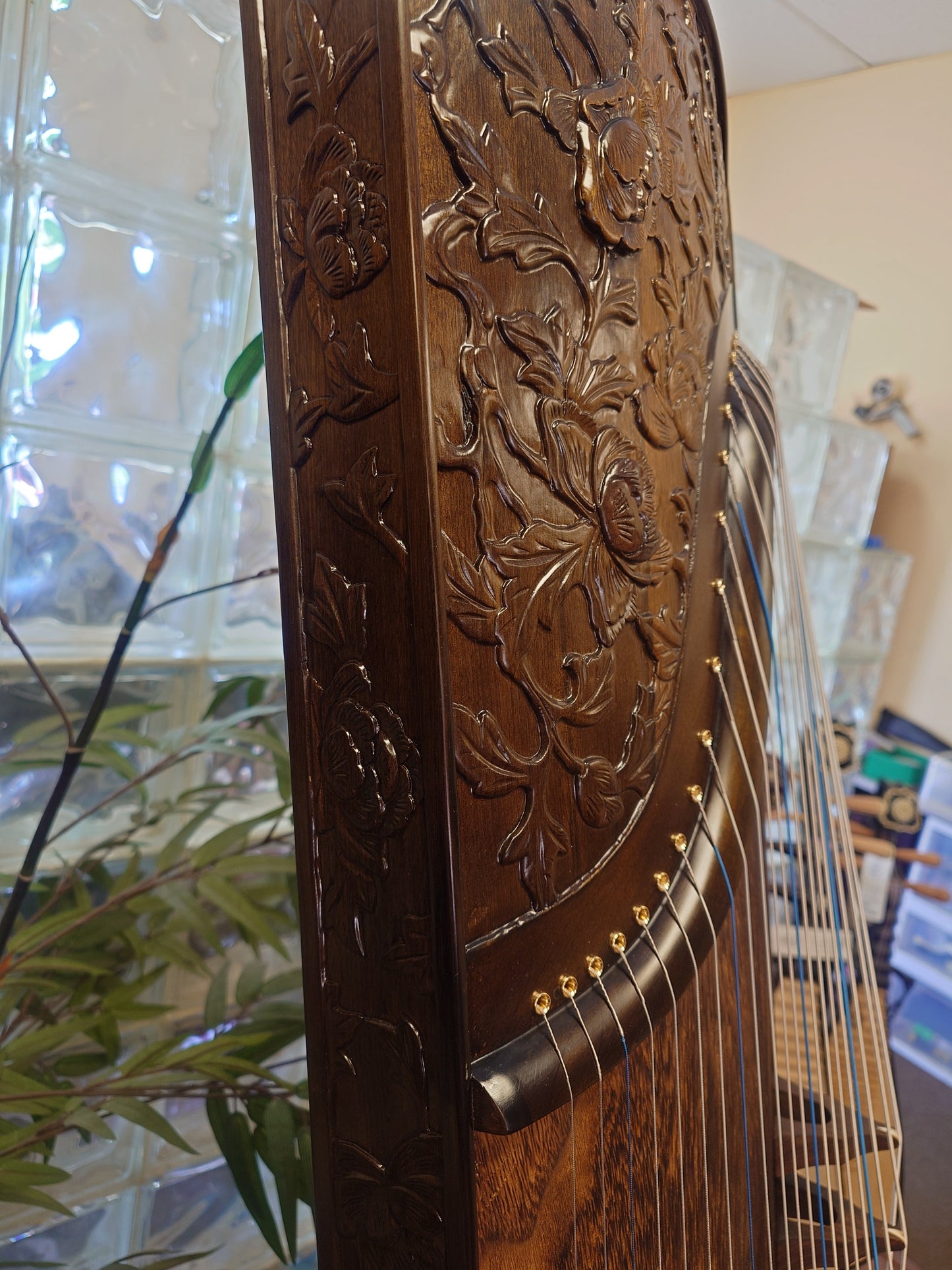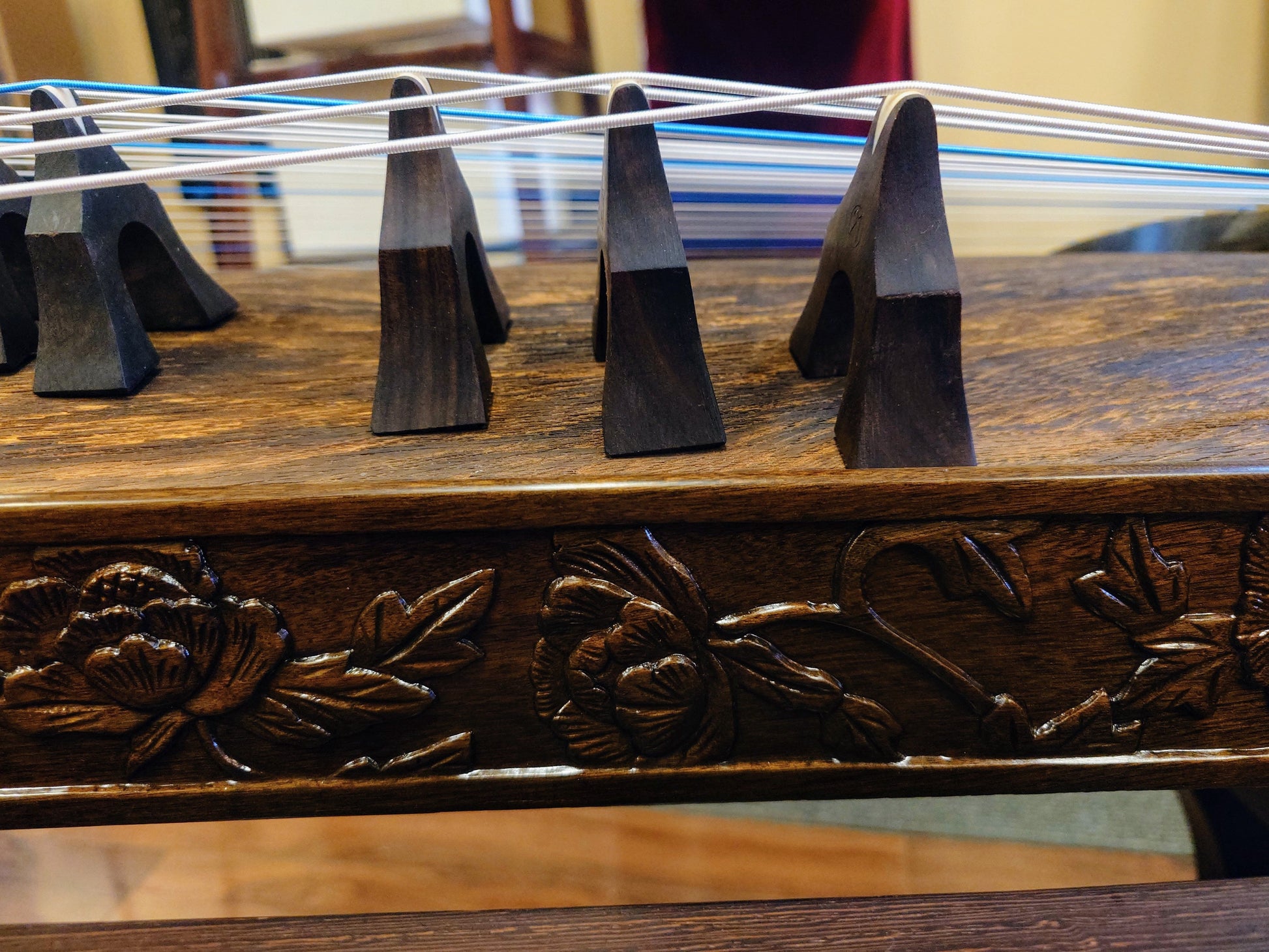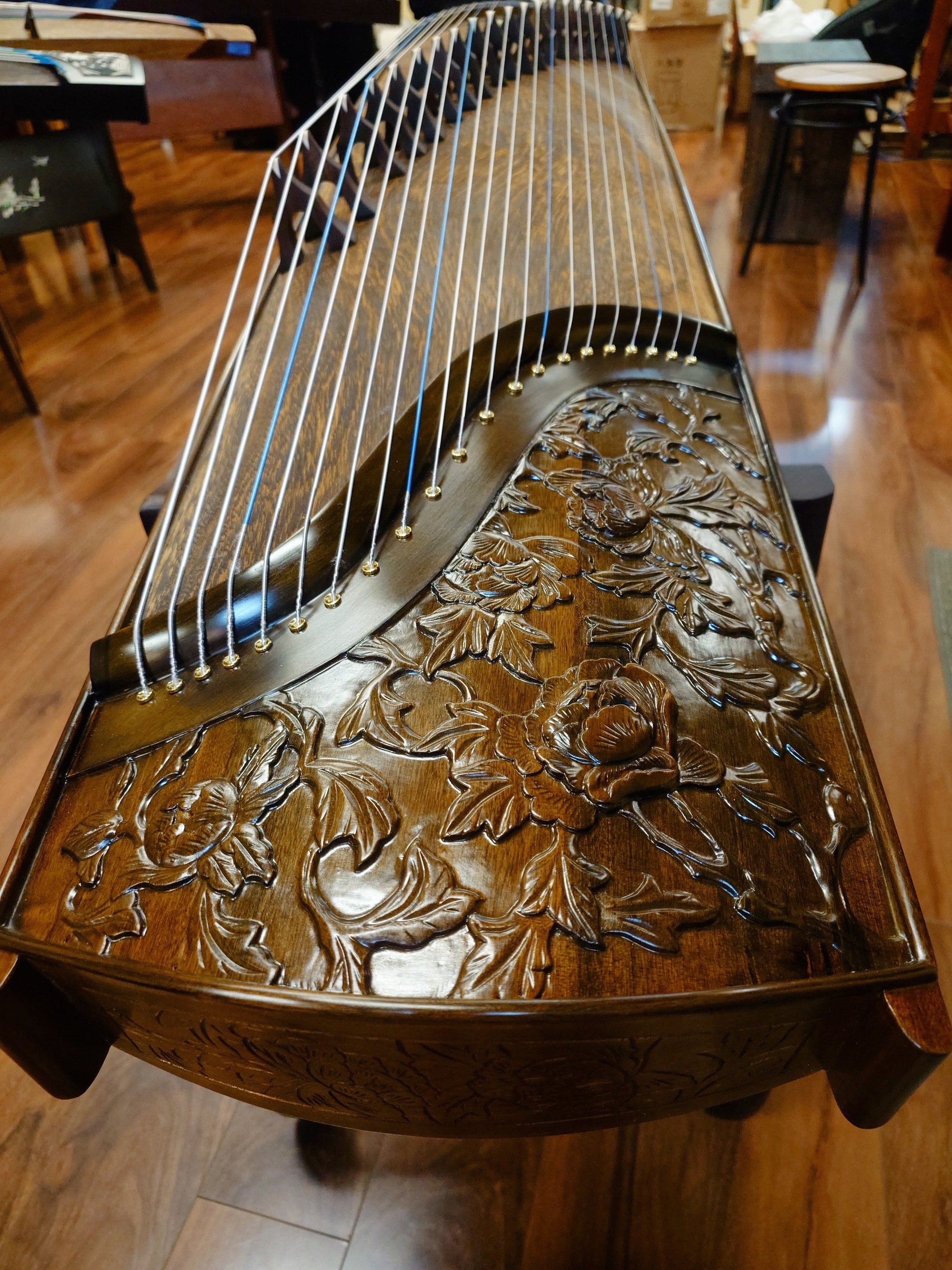 The carved-out sound body provides full volume with a focused, clean sound. The ebony bridges are specifically designed for this guzheng and it is equipped with Lianqing concert B strings for professional playing.